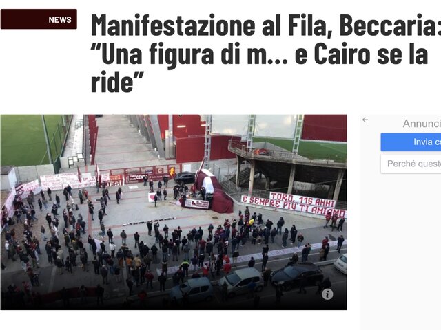 Maidomi 4311 Joined: 03-Jun-2006 4591 messaggi Inviato December 6, 2021 (modificato) Ieri c’è stata una manifestassiun contro Cairo al fila e fondi. Il servizio sulla busiarda dell’ineffabile Manassero è la perfetta rappresentazione del giornalismo torinese quando tratta di quegli sfigati: “quasi mille tifosi cagata…” . Poi vedi le foto e vedi che al massimo erano in 100, per di più perchiulati da mecu beccaria. La solita solfa: qualunque cosa che li riguardi è moltiplicato per 10, da sempre… Modificato December 6, 2021 da Maidomi 3 Condividi questo messaggio Link di questo messaggio Condividi su altri siti