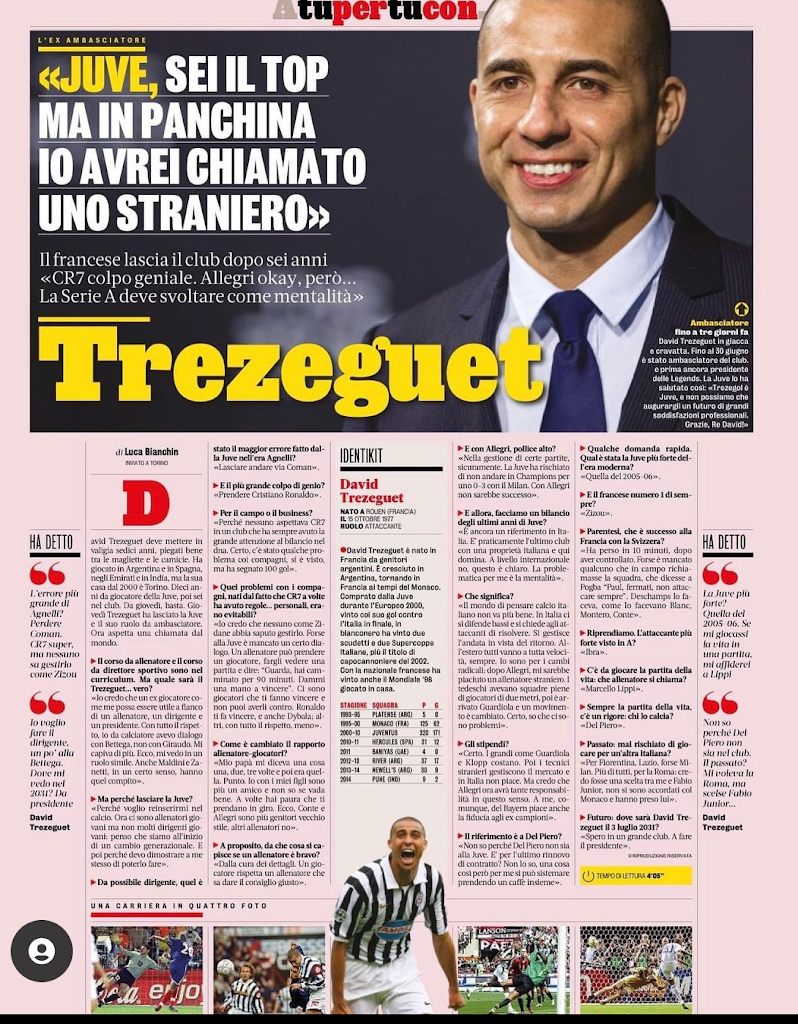 ...sentivamo la mancanza delle esternazioni di Trezeguet , un altro che ha passato gli ultimi 3 anni a prendere un lauto stipendio dalla juventus per viaggiare  e divertirsi a rappresentare la societa' di cui adesso sente la necessita' di dire che sta sbagliando ancora le scelte.....dall alto della sua esperienza come tecnico