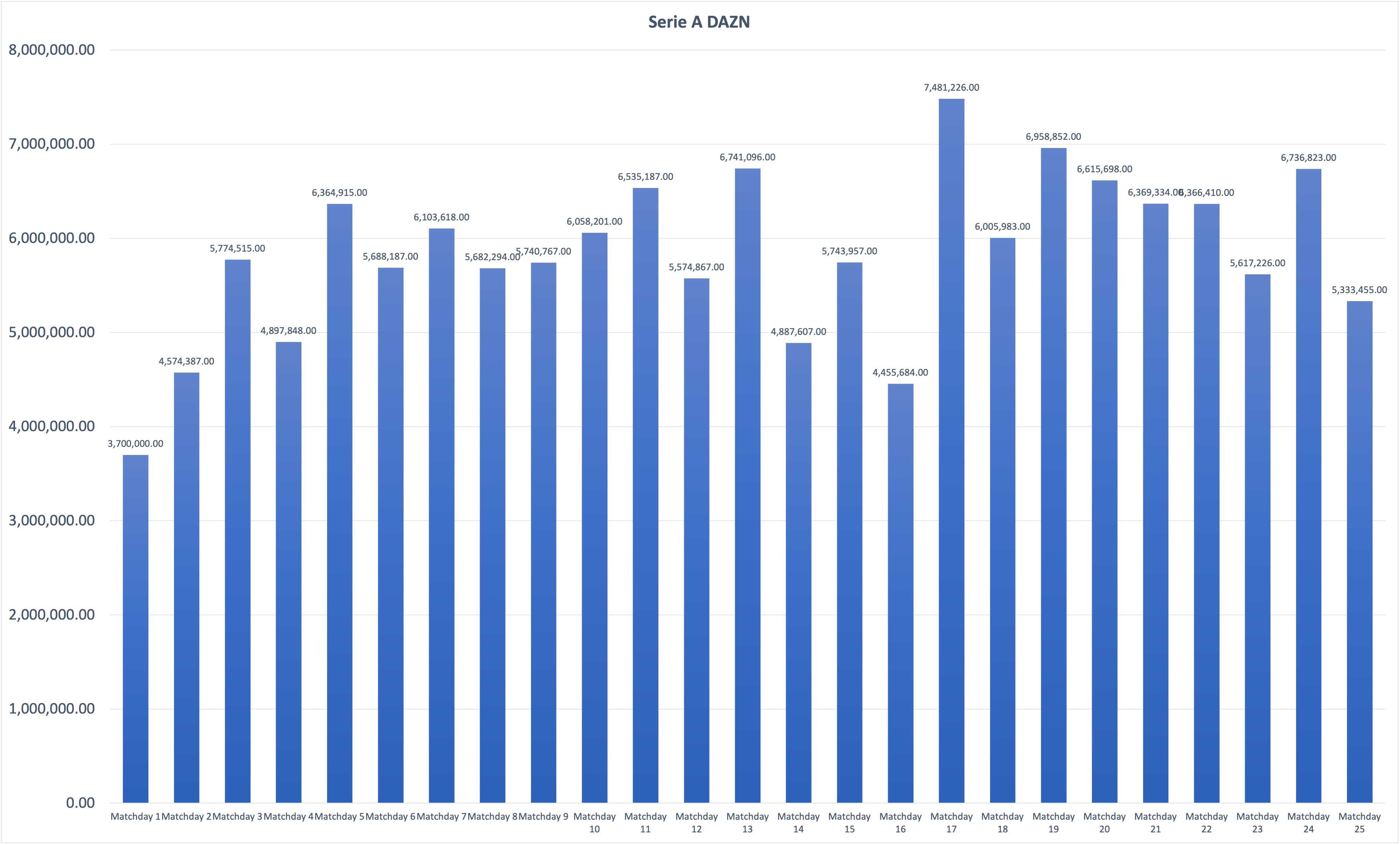 Tra l'altro la giornata 16 (che era il minimo) era una fantastica idea della Lega di giocare in infrasettimanale a inizio gennaio, con molta gente in vacanza o con l'abbonamento ancora bloccato dopo il mondiale. Speriamo con il turno infrasettimanale di inizio maggio di superare anche quel minimo, comunque sarebbe interessante confrontare anche i dati della scorsa stagione in questo periodo per vedere qual è il trend e se "il Napoli campione d'Italia" tira.