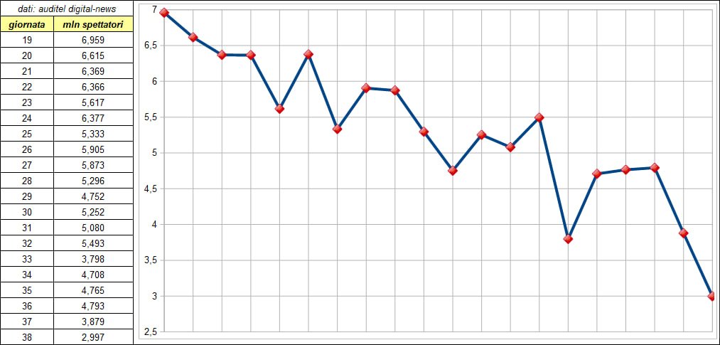 arboreto 1024 Joined: 26-Aug-2006 3040 messaggi Inviato June 6, 2023 3 ore fa, Kris ha scritto: Non ti dico che non ci saranno eccezioni, sicuramente un calo si vedrà (e si è già visto) ma anche qui sul forum io leggo sempre gli stessi nomi, la massa continuerebbe a seguire anche in B. Che ci crediate o no io conosco tanti Juventini che dicono che la penalizzazione ci è stata data perché sicuramente qualcosa abbiamo fatto... Inviato dal mio CPH2173 utilizzando Tapatalk Ma non so, poi alla fine bisogna vedere i numeri e i dati auditel che sono gli unici oggi che ci possono dare una misura di chi segue la serie a dimostrano un netto calo Condividi questo messaggio Link di questo messaggio Condividi su altri siti