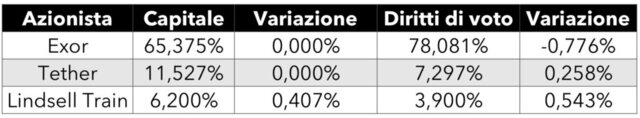 Tether si conferma invece secondo azionista della Juve: la società che fa capo a Paolo Ardoino è in possesso dell'11,527% delle azioni del club, che equivalgono al 7,297% dei diritti di voto, facendo registrare un lieve incremento rispetto a prima dell'aumento di capitale (7,039%). Terzo azionista è invece Lindesll Train: 6,2% del capitale e 3,9% dei diritti di voto in assemblea".