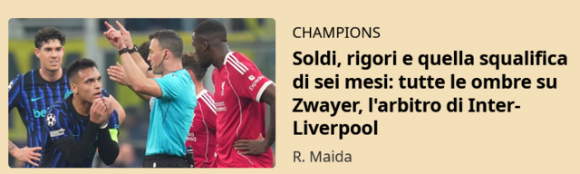 ampeg 5904 Joined: 17-Apr-2007 31322 messaggi Inviato 9 ore fa 13 ore fa, lunastorta ha scritto: Quanto rosikano nella redazione delle fogne? Chiedo scusa per aver regalato un click a quella gentaglia ma mi sono letto l'articolo intero di Roberto Maida alla fine sono contento di aver regalato un click perché mi fa estremamente piacere vederli ridotti a rosicare con cotanta veemenza sostanzialmente è costretto ad ammettere che l'errore è stato del VAR che non si doveva intromettere. Quello che succede puntualmente quando arbitrano la Juve, solo che a noi ci dicono che va bene così, a cominciare dal capo degli arbitri. Quando capita a loro invece vanno a cercare col lanternino le faccende vecchie di vent'anni. FALLO O IMBROGLIO Il filo sottile che separa la trattenuta dalla simulazione si annoda nel dibattito, peraltro già alleggerito dalle ammissioni del Liverpool: l’allenatore Arne Slot ha detto che "in Premier un rigore del genere non sarebbe fischiato" mentre il tiratore Dominik Szoboszlai ha suggerito all’Inter "di prendersela con l’arbitro e non con me" e il capitano, Virgil Van Dijk, è scoppiato a ridere in diretta televisiva nel commentare l’episodio. I dirigenti dell’Inter, capeggiati dal presidente Beppe Marotta, hanno in effetti presentato delle garbate rimostranze a Zwayer, al quale nella pancia di San Siro hanno rimproverato la scarsa personalità: avrebbe dovuto decidere in autonomia, senza lasciarsi teleguidare. L’Uefa da parte sua condivide il concetto generale: quel tipo di falli deve essere giudicato dall’arbitro e non dal Var. L’errore, o meglio il peccato, sarebbe quindi da attribuire a Storks, che si è intromesso in una questione che non lo riguardava. Una volta davanti al monitor per Zwayer, osservato il movimento della maglia di Wirtz che si allunga di circa 30 centimetri, fischiare il rigore diventava quasi automatico. https://www.giornalaccio rosa.it/Calcio/Champions-League/11-12-2025/inter-liverpool-l-arbitro-zwayer-e-il-suo-passato-anche-il-var-sotto-esame.shtml?refresh_ce Condividi questo messaggio Link di questo messaggio Condividi su altri siti
