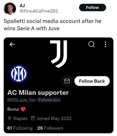 Kris 1605 Joined: 20-Jul-2008 7930 messaggi Inviato 11 ore fa A quanto pare, Comolli voleva un allenatore straniero ma che gli sia stato detto di prendere un italiano. Ancora con quella vecchia mentalità Probabilmente l'algoritmo gli avrà selezionato 20 allenatore della serie c francese che hanno i seguenti requisiti:- accettare contratto part time verticale di 6 mesi- ingaggio basso- nessuna richiesta di nuovi calciatori da comprare - nessuno staff- disponibilità a lavorare il fine settimana (questa è fondamentale)- reperibilità notturna per accompagnare i calciatori a svagarsi (son troppo stressati)Inviato dal mio SM-S938B utilizzando Tapatalk Condividi questo messaggio Link di questo messaggio Condividi su altri siti