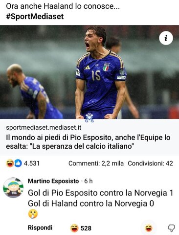 Durante la partita, i commentatori francesi di L'Equipe han detto "Gol di Pio Esposito. La meraviglia del calcio italiano" .asd